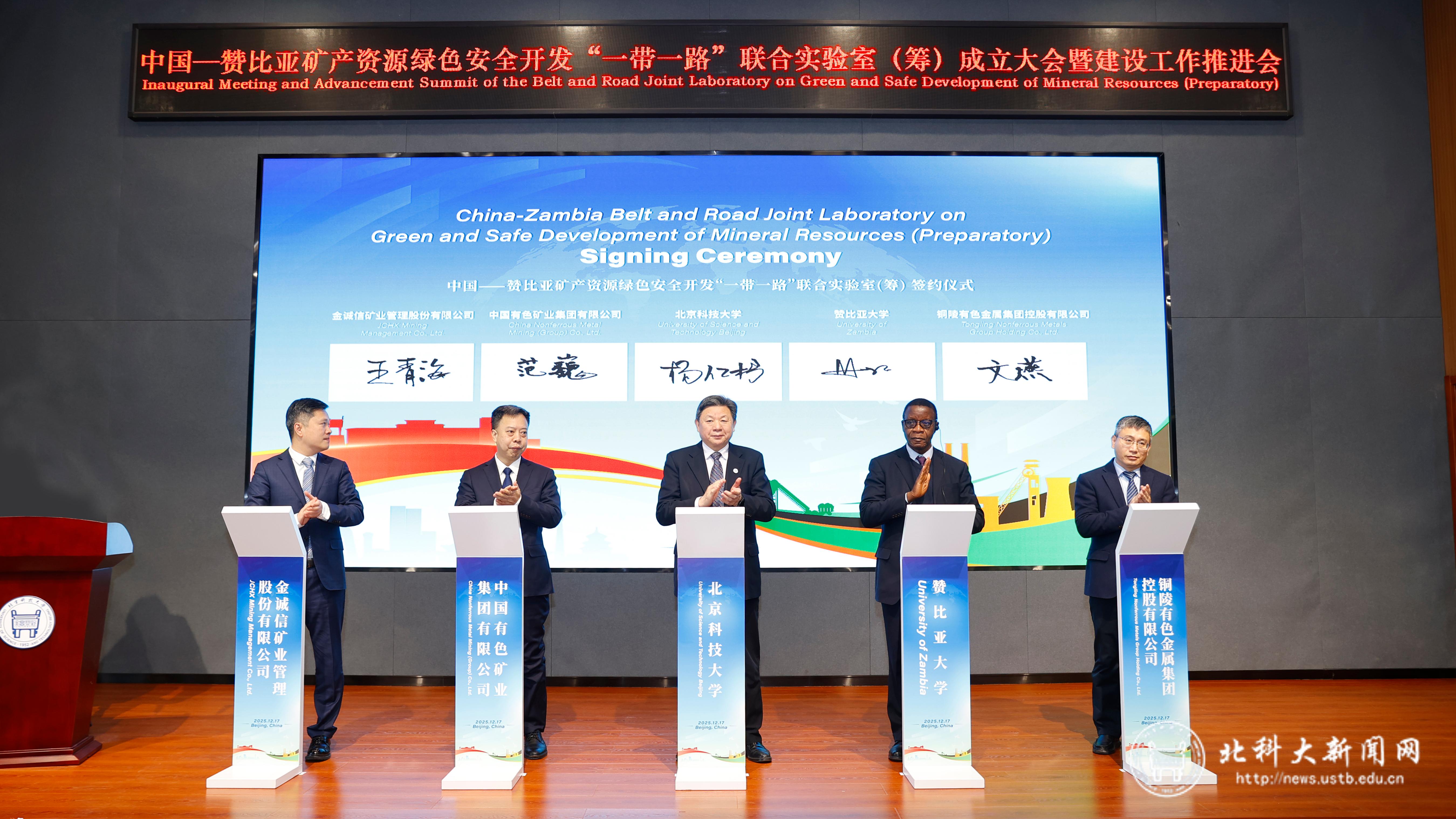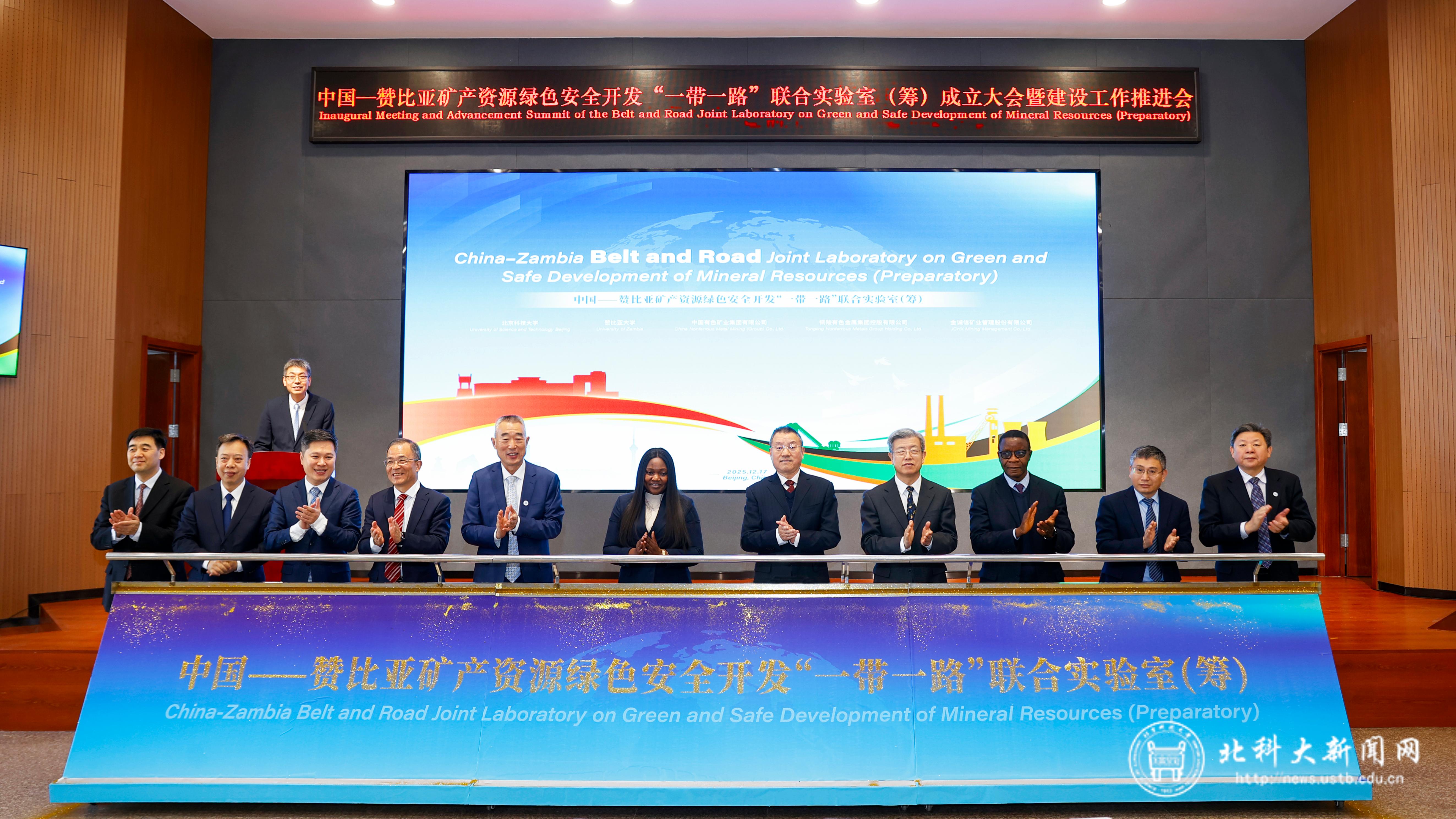 12月17日,中国—赞比亚“一带一路”联合实验室国家级科技创新平台建设工作推进会在学校举行。该实验室聚焦绿色矿产领域,是中赞两国首个“一带一路”联合实验室。中赞两国政府、高校、科研机构及中外合作建设单位代表齐聚一堂,共襄盛举。赞比亚驻华大使馆大使代表娜玛卡朵,赞比亚大学校长蒙迪亚·穆亚,国家矿山安全监察局党组成员、副局长裴文田,中国有色矿业集团有限公司总经理张晋军,中国有色矿业集团有限公司副总经理范巍,铜陵有色金属集团股份有限公司党委书记、总经理文燕,金诚信矿业管理股份有限公司董事长王青海;学校党委书记武贵龙,校长杨仁树,中国工程院院士吴爱祥,副校长张卫冬以及党委常委、宣传部部长尹兆华出席会议。会议由学校副校长焦树强主持。