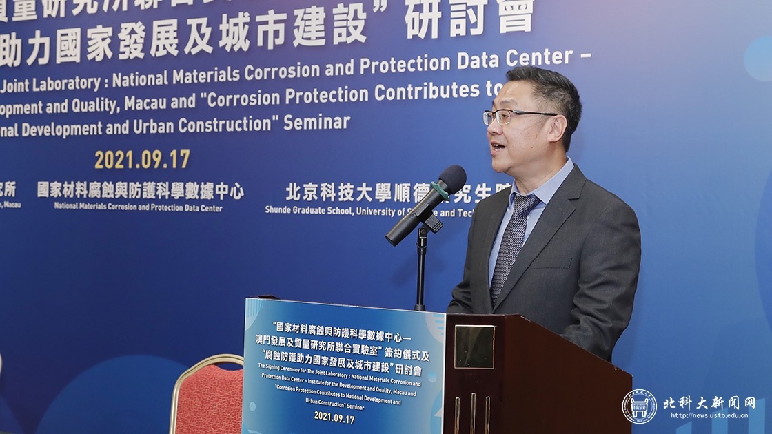 In order to implement the nation’s strategy of promoting the construction of the Guangdong-Hong Kong- Macau Greater Bay Area and the central government to the Macau work deployment in the new era, give full play to Macau’s active role in the construction of the Guangdong-Hong Kong- Macau Greater Bay Area and the Belt and Road Initiative (BRI), accelerate the Macau Special Administrative Region(SAR) integrating into the overall situation of national development, and further enhance the supporting and leading role of the Guangzhou-Hong Kong-Macau Greater Bay Area in national economic development and opening-up, on the afternoon of September 17th, Shunde Graduate School of USTB, Institute for the Development and Quality of Macau and National Materials Corrosion and Protection Data Center held the Signing Ceremony for the Joint Laboratory: National Materials Corrosion and Protection Data Center – Institute for the Development and Quality, Macau. The parties will rely on the location advantage of Macau and Foshan in the Guangzhou-Hong Kong-Macau Greater Bay Area and policy advantage of the Macau SAR, give full play to their respective characteristics in talents, disciplines and scientific research, jointly promote the in-depth integrated development of Beijing, Guangdong, and Macau in talent cultivation, scientific research, achievement transformation, education and teaching, improve the overall innovation capability of the region, contribute to the construction of the Guangdong-Hong Kong- Macau Greater Bay Area and the BRI.