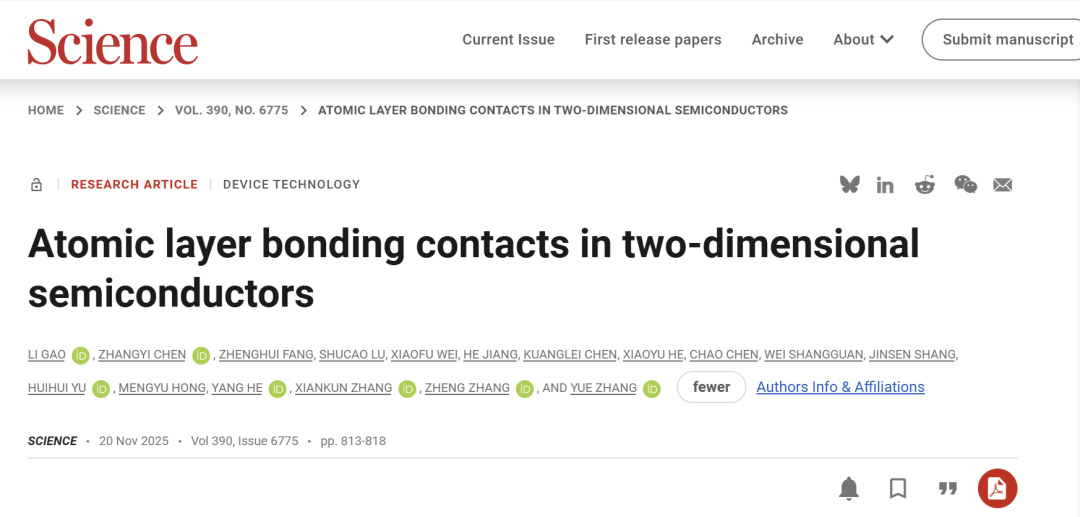 近日 《科学》(Science) 发表了 我校前沿交叉科学技术研究院 最新科研成果 《二维半导体的原子层键合接触》 (Atomic layer bonding contacts in two-dimensional semiconductors) Science, 390, 6775, 813-818, (2025)