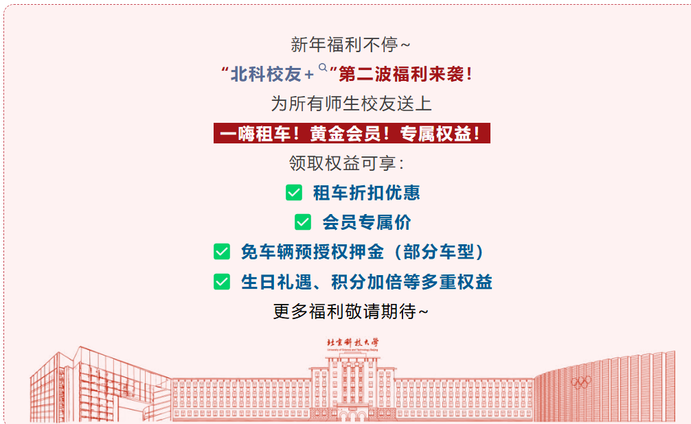 新年福利不停~“北科校友+”第二波福利来袭! 为所有师生校友送上 一嗨租车!黄金会员!专属权益!领取权益可享: ✅ 租车折扣优惠 ✅ 会员专属价 ✅ 免车辆预授权押金(部分车型) ✅ 生日礼遇、积分加倍等多重权益更多福利敬请期待~