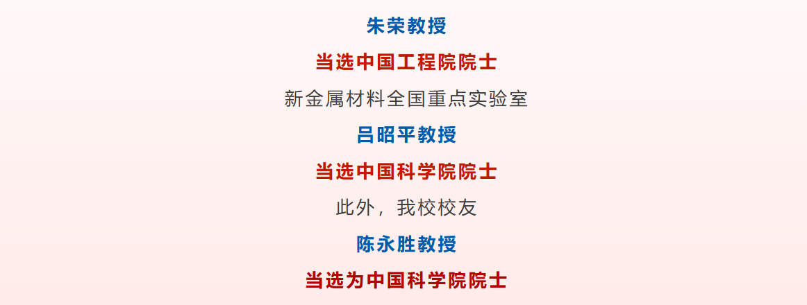 近日 中国科学院、中国工程院 公布了2025年院士增选结果 我校碳中和学院、绿色低碳钢铁冶金全国重点实验室 朱荣教授 当选中国工程院院士 新金属材料全国重点实验室 吕昭平教授 当选中国科学院院士 此外,我校校友 陈永胜教授 当选为中国科学院院士