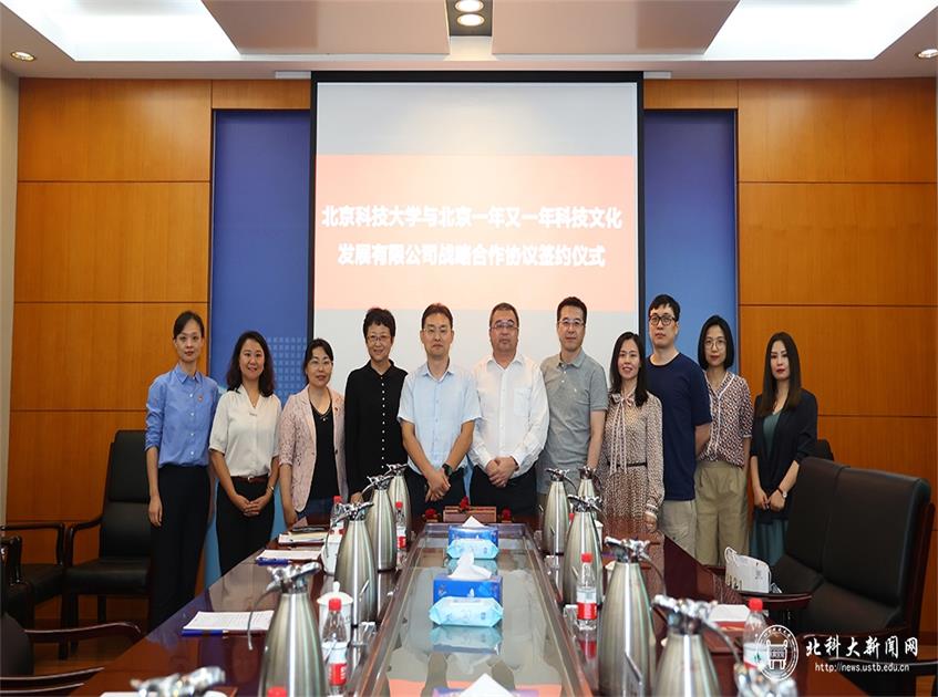 9月10日下午,北京科技大学与北京一年又一年科技文化发展有限公司签署战略合作协议,双方将在文创产品开发与应用,学生创新设计大赛等方面开展紧密合作,签约仪式在办公楼320举行,北京一年又一年科技文化发展有限公司董事长刘国际、执行总裁邵亚中,学校党委副书记于成文出席签约仪式。