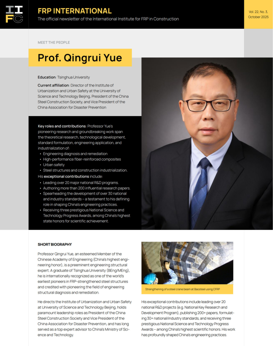 近日,国际土木工程复合材料学会(International Institute for FRP in Construction, IIFC)在其发布的2025年10月官方报道中,以“Meet the People”专栏形式,重磅刊登了对我国著名复合材料专家、中国工程院院士岳清瑞教授的深度专访,这是中国大陆学者首次在该学会官方报道中得到专访。